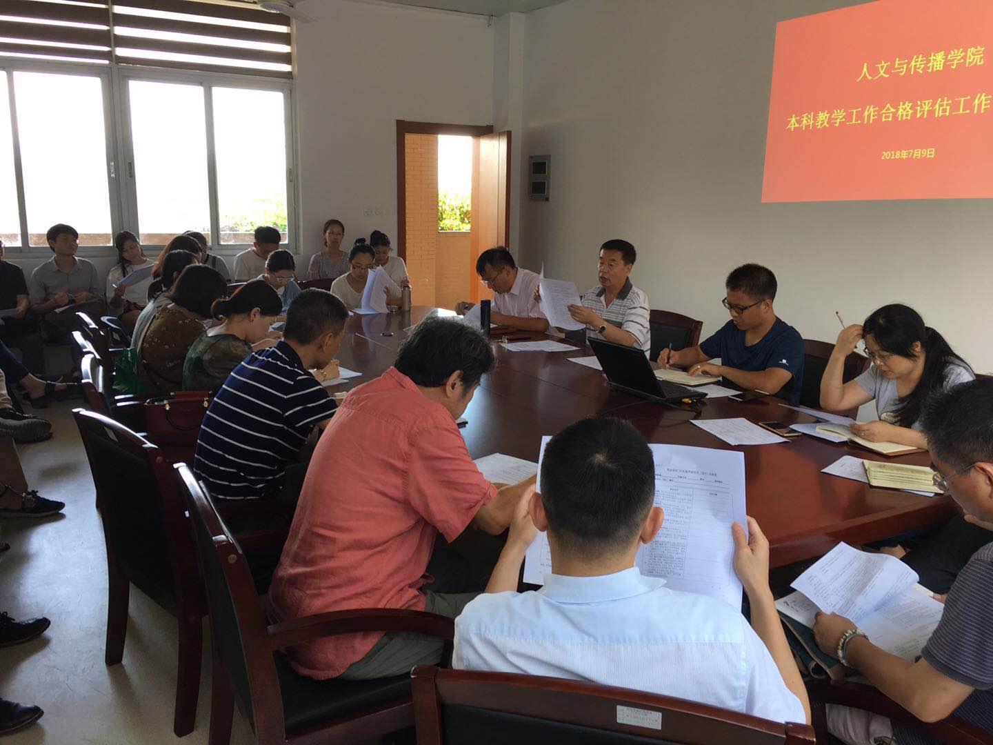 2018年7月9日中午,人文与传播学院本科教学工作合格评估第三次预评估工作部署会在文科楼501会议室召开。郗永勤院长、冯杰副院长、张斌党总支书记、沈晓琼办公室主任及全体教职工参加了会议,会议由郗永勤院长主持。