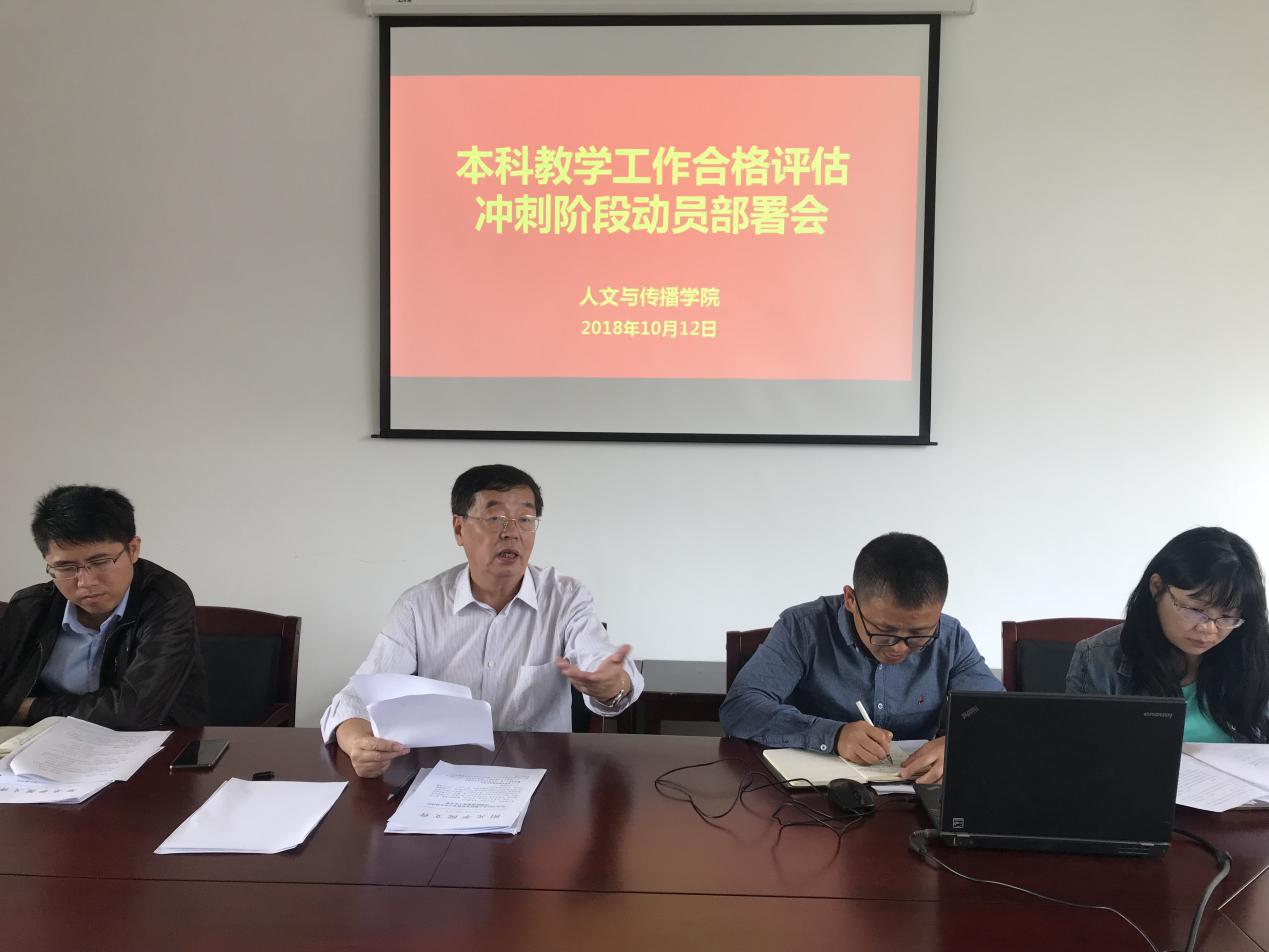 在迎接本科教学合格评估工作进入最后冲刺阶段,为切实解决学院迎评促建工作中存在的主要问题、做好各项筹备工作,2018年 10月12日下午,人文与传播学院在文科楼501会议室召开本科教学工作合格评估冲刺阶段动员部署会。郗永勤院长主持此次会议,全体教职工参会。