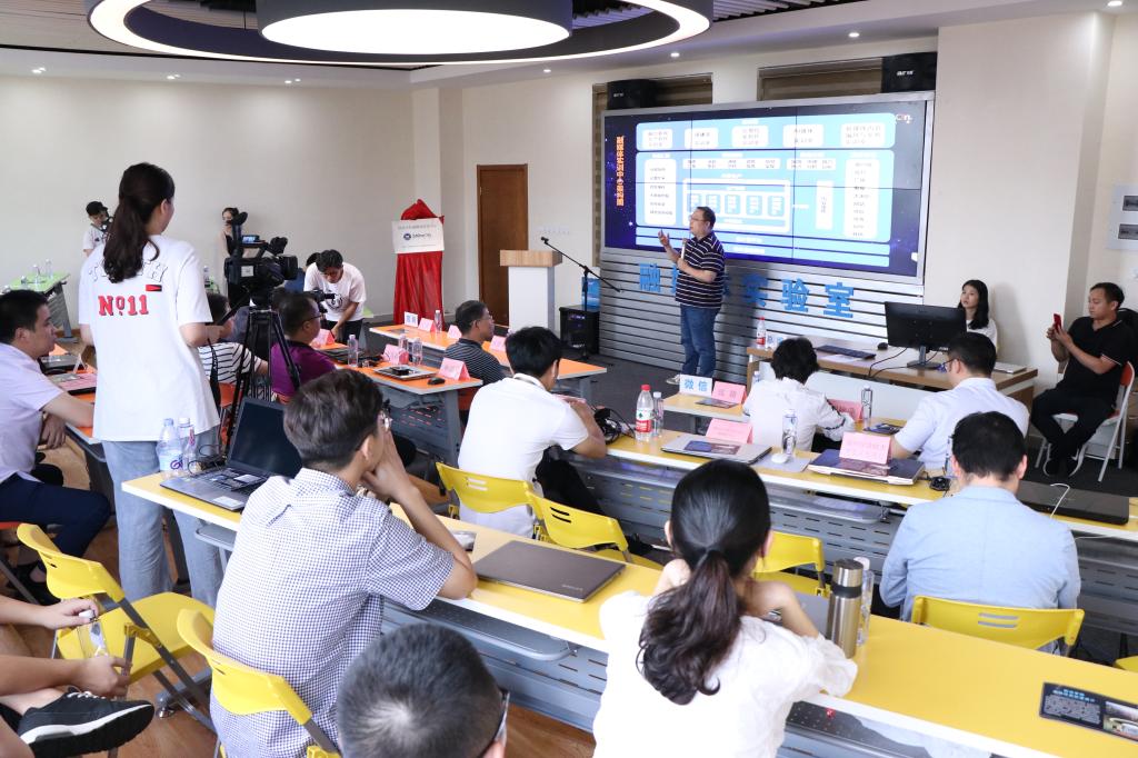 随后,陈少平书记、中广上洋营销中心总经理张学敏、阳光学院人文与传播学院郗永勤院长、福州朗星科技有限公司销售总监林敦晃一同为实验室揭牌。并由广播电视编导专业王宏老师带领各位来宾参观融媒体实验中心,对来宾的提问进行解答。