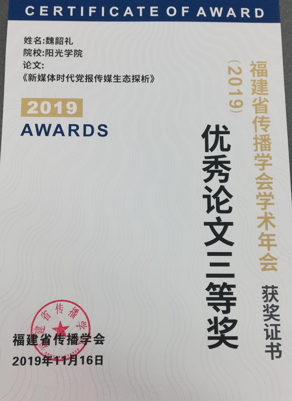 人文与传播学院魏韶礼、黄琳、刘颖琪等三位老师应主办方邀请参会,并在本届论文评选中,黄琳老师的《数字化背景下古村落文化遗产保护路径探析》、魏韶礼老师的《新媒体时代党报传媒生态探析》论文分别获得了二等奖、三等奖,实现了获奖论文零突破。此外,黄琳和魏韶礼两位老师还分别在区域文化与传播、数字媒体与传播分论坛上作了发言,就相关议题与其他学者进行深入的探讨与交流。