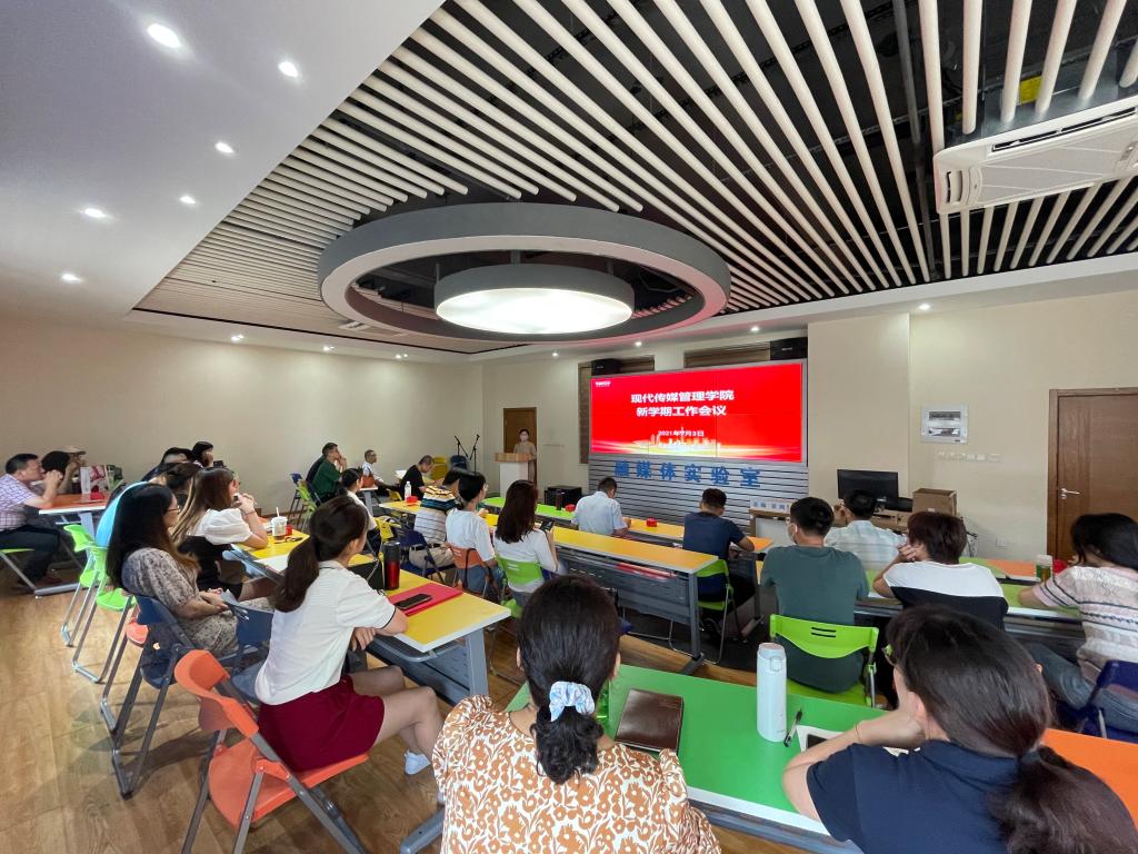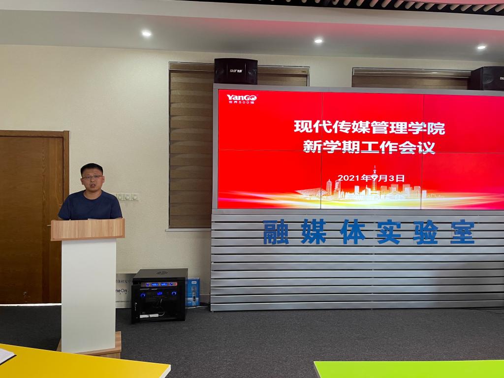 2021年9月3日下午,现代传媒管理学院在行政楼融媒体中心召开新学期全院工作会议,传达学校新学期工作会议精神,安排部署学院新学期工作任务。学院院长张其春教授主持会议。
