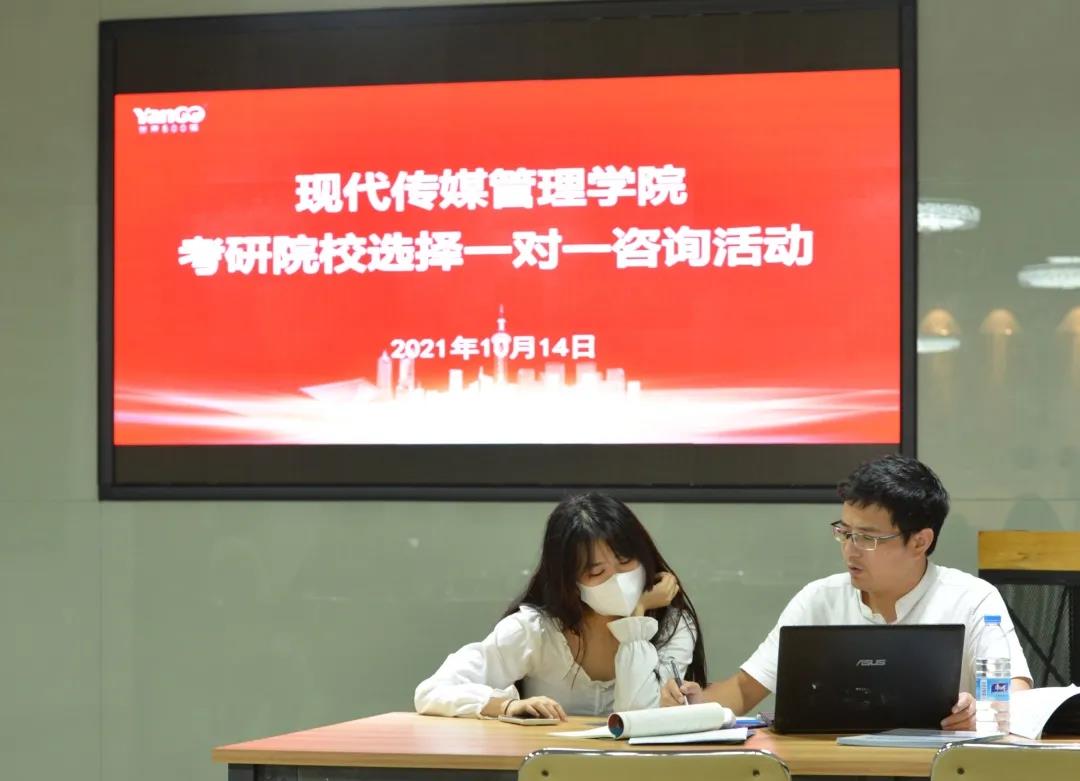 为服务有志于考研的广大学子,快速提升同学们对于考研形势的认识,2021年10月14日晚六点半现代传媒管理学院行政楼408召开了面向学院学子的考研院校报名选择工作。专业老师对有志考研的学子开展一对一的解惑,为同学们的考研路上点亮一盏明灯。