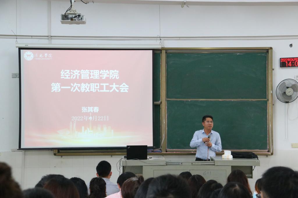 会议上,张其春院长首先介绍了经济管理学院教职工的团队分工,并提出按后续实际工作的需要增设更多的职务,为经济管理学院的高素质素质队伍建设注入更多强劲力量,希望各位教职工作出更多新的优秀的成绩,努力将经济管理学院师资力量强大起来。