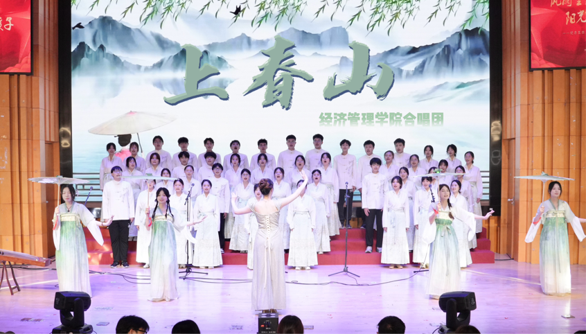 紧接着,合唱团又带来了另一首动人的歌曲《上春山》。这首歌曲旋律优美,能够听出中国古诗词的韵味。经济管理学院合唱团的学生们用他们清澈的歌声,将这首巧妙化用14首古诗词的歌曲演绎得淋漓尽致,让在场的每一个人都感受到了那份纯真和美好。